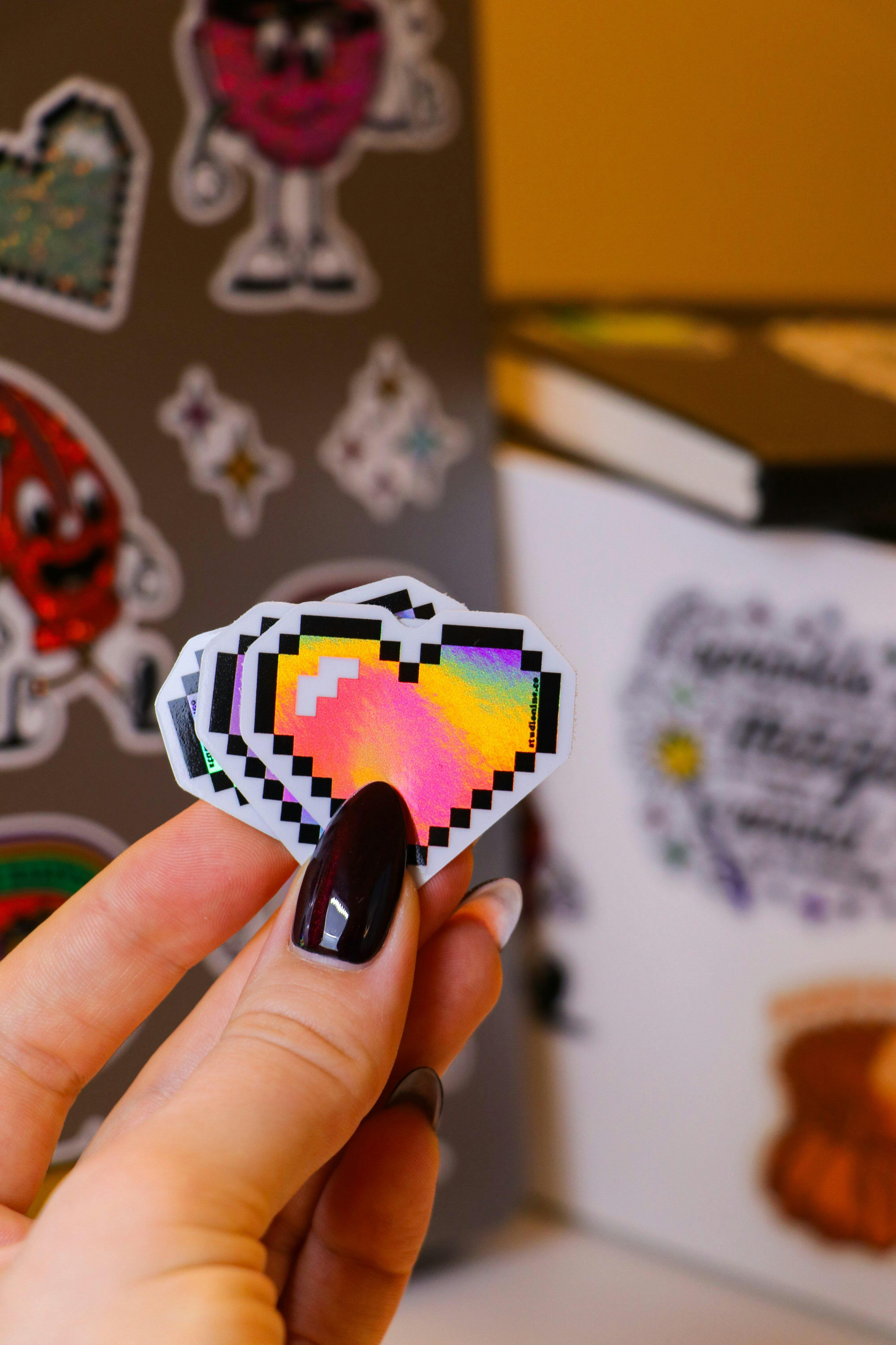 Holographic sheet labels give your design a rainbow shimmer that changes at every angle. Each easy‑peel sheet (10" × 10") has kiss‑cut labels in whatever shape you desire. We print in full color over premium holographic film and layer in optional white ink, so you can highlight specific areas with prismatic flair.